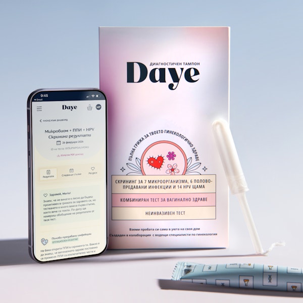 Поемането на контрол върху твоето сексуално здраве никога не е било по-лесно с иновативния Диагностичен тампон на Daye. Всичко, което трябва да направиш, е да поставиш тампона за 20 минути и да го извадиш. Не е необходимо да си в менструация, което означава, че може да си в менопауза, бременна или на дългосрочна контрацепция. Изпрати кутията за връщане и нашите акредитирани лаб оратории ще обработят твоята проба.